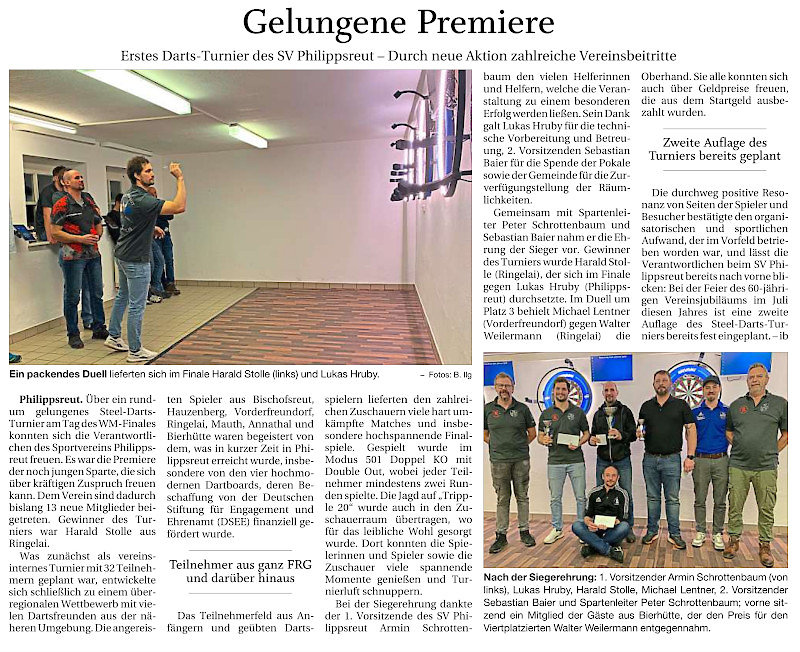 Am 3. Januar 2026 veranstaltete der SV Philippsreut erstmals ein Darts-Turnier. In der Passauer Neuen Presse erschien darüber der nachfolgende Artikel. Sie finden ihn auch unter "Vereinsgeschehen".